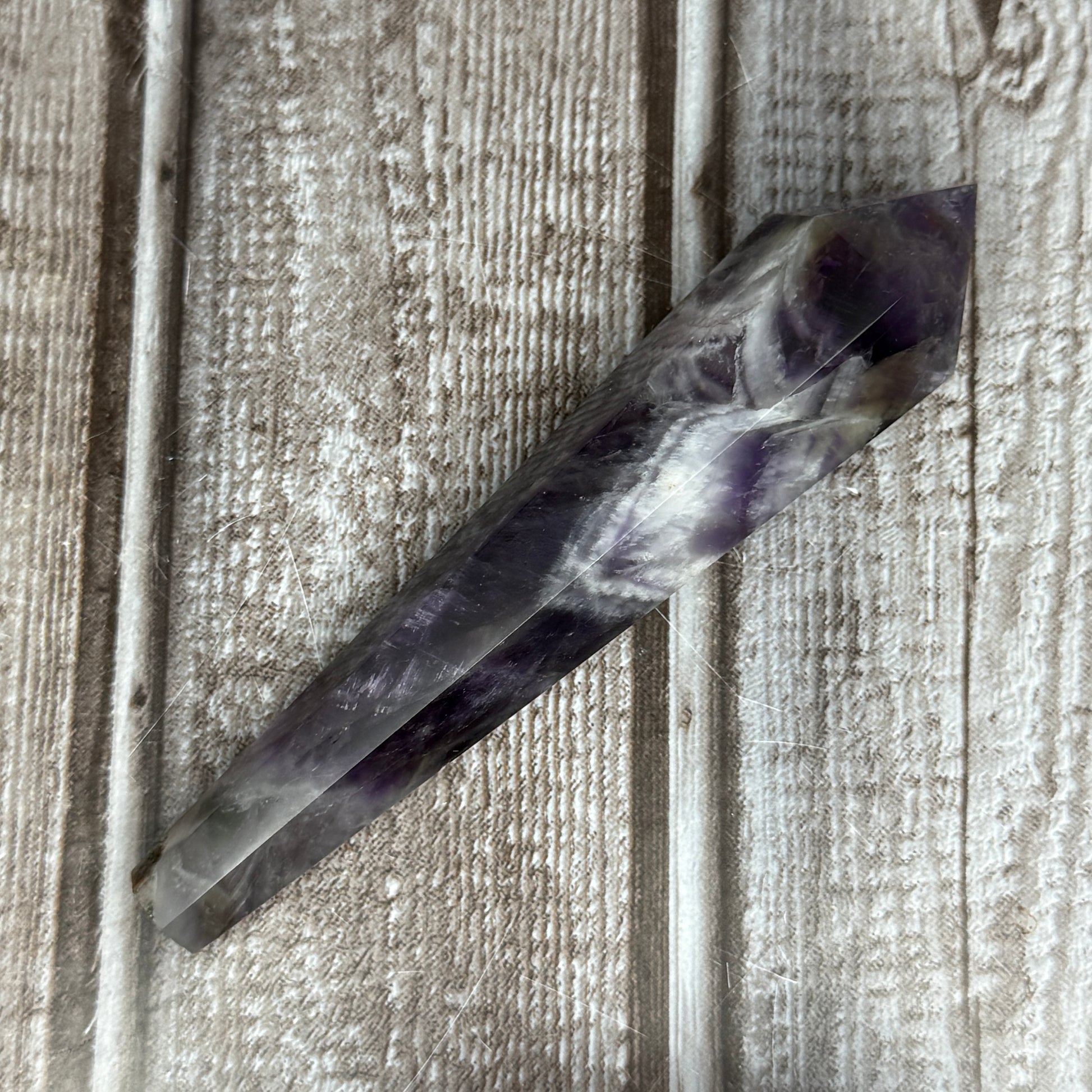 Harness the calming vibes of this striking Chevron Amethyst Wand, where purple and white stripes create nature's own geometric masterpiece. Perfect for crystal enthusiasts and meditation lovers, this wand channels peaceful energy while adding a touch of mystical flair to your space. Whether you're using it for spiritual practices, energy work, or simply admiring its natural beauty, this gem is sure to spark joy and serenity. Let your intuition guide you—this wand is ready to elevate your crystal collection!