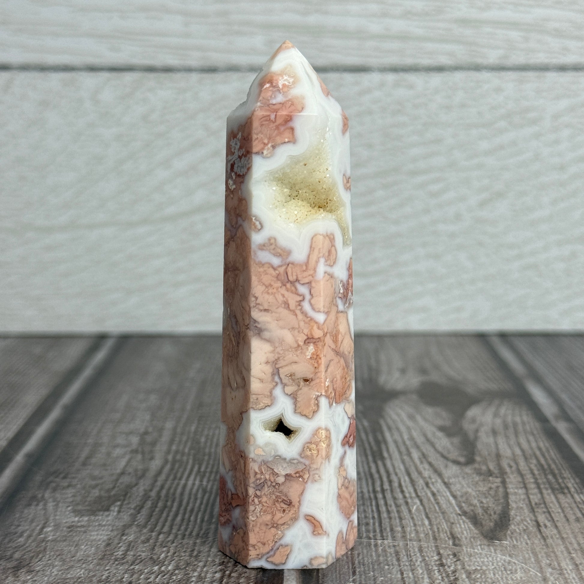 Rise and shine with this stunning Flower Agate Tower! Featuring delicate floral patterns that seem to bloom right from the stone, this natural beauty brings a touch of garden magic to any space. Perfect for crystal collectors and nature lovers alike, it's a conversation starter that radiates positive energy. Whether you're building your collection or gifting someone special, this tower adds charm and character to shelves, desks, or meditation spaces. Let your inner flower child flourish!