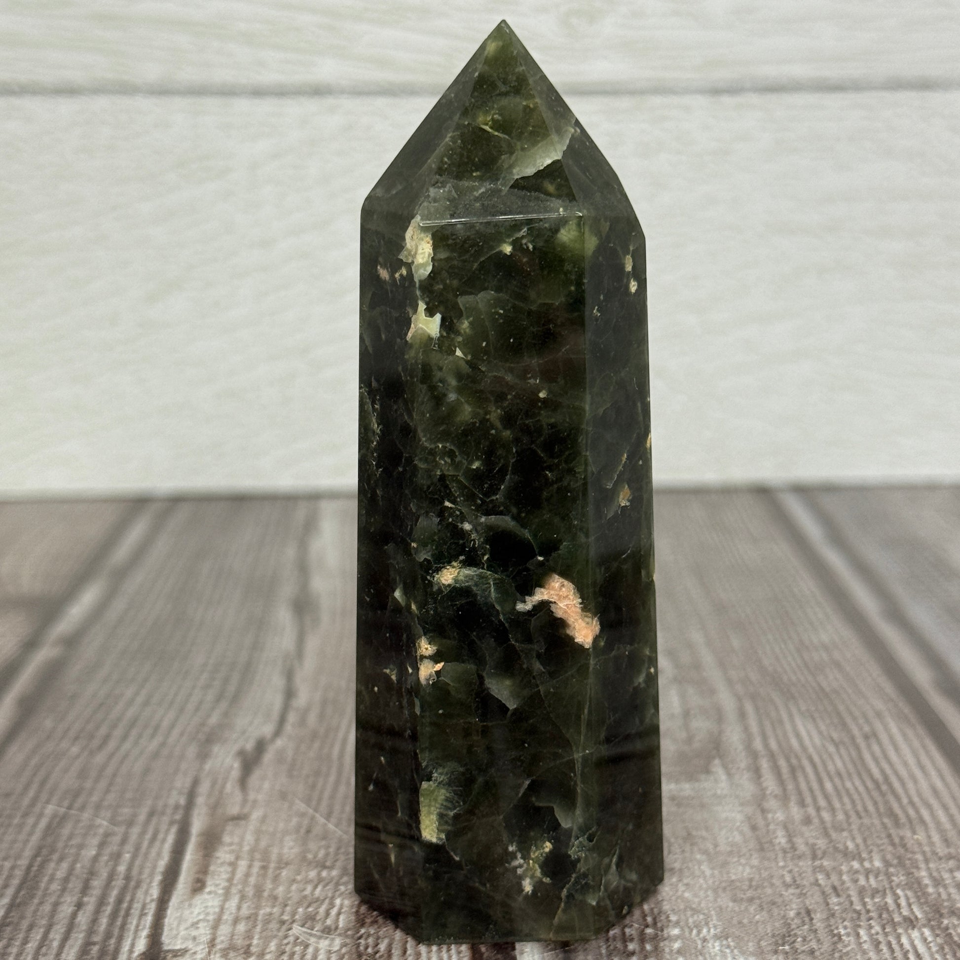 Elevate your crystal collection with the Green Tourmaline & Sunstone Tower, expertly crafted to showcase the unique synergy of these two powerful stones. Green Tourmaline is valued for its ability to promote emotional healing and balance, while Sunstone is known to inspire vitality and personal power. This tower shape enhances energy flow, making it ideal for meditation, energy work, or as a striking focal point in any space. Perfect for those seeking to harmonize heart-centered energy with uplifting solar vibrations.