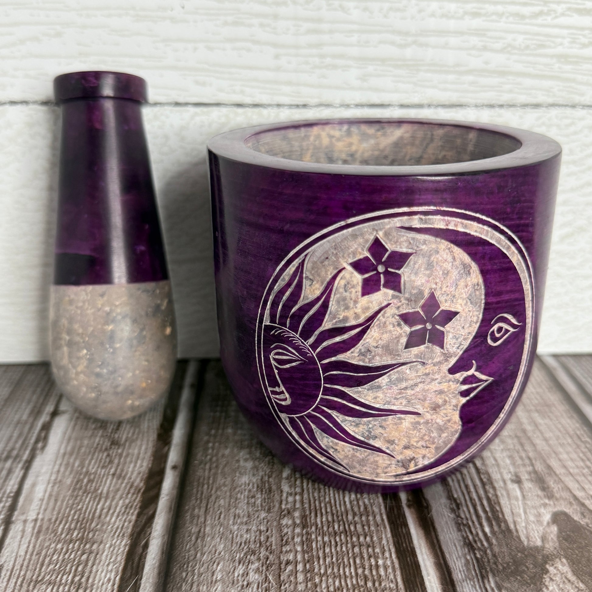 A mortar & pestle is used to crush/grind herbs and resins. The stick-shaped pestle crushes the ingredients in the bowl.