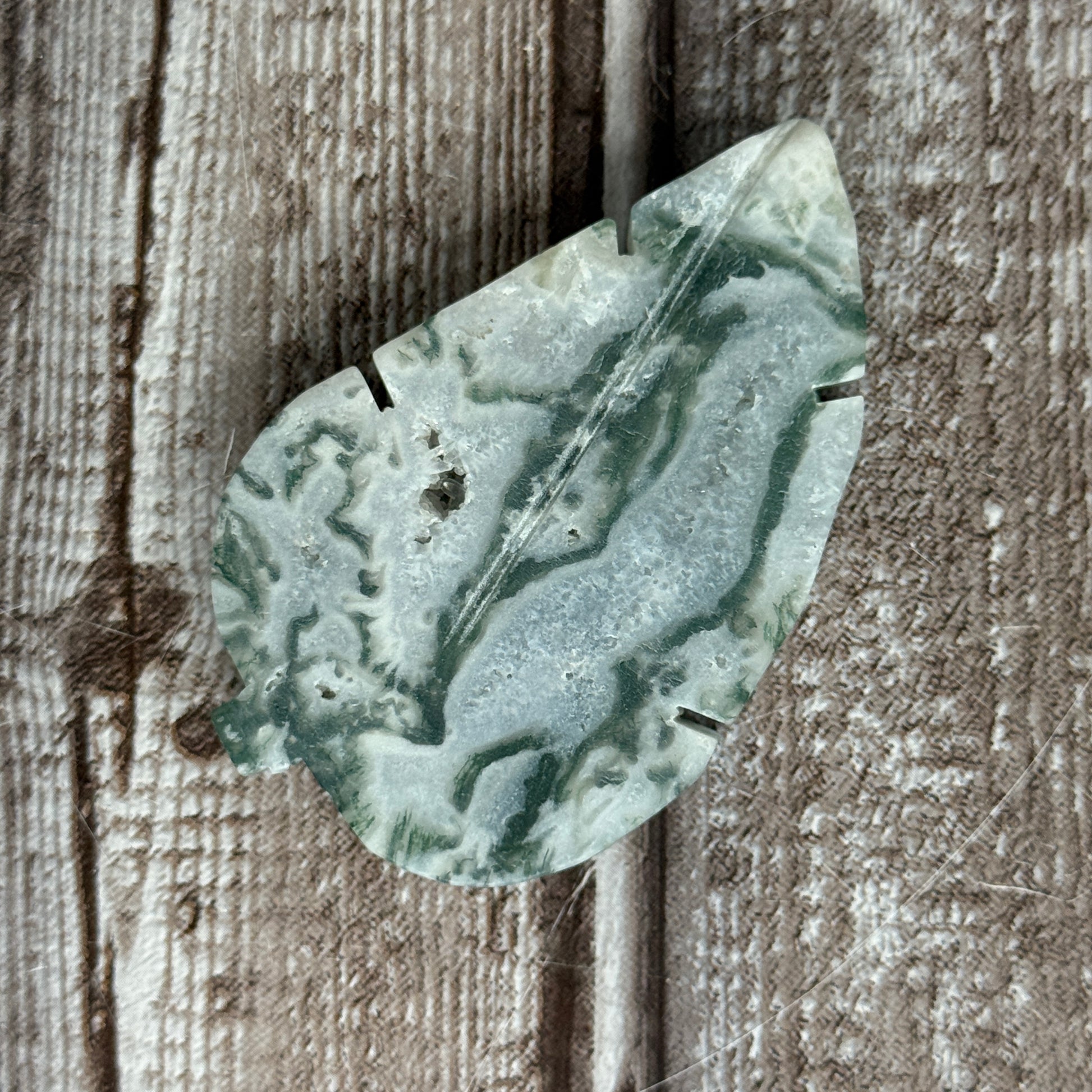 Transform your space with our Moss Agate Leaf. Hand-carved from beautiful moss agate, this leaf brings a calming and grounding energy to any room. Perfect for meditation or as a unique decor piece, its metaphysical properties promote abundance and growth in all aspects of life. Bring nature's beauty and positive vibes into your home today!