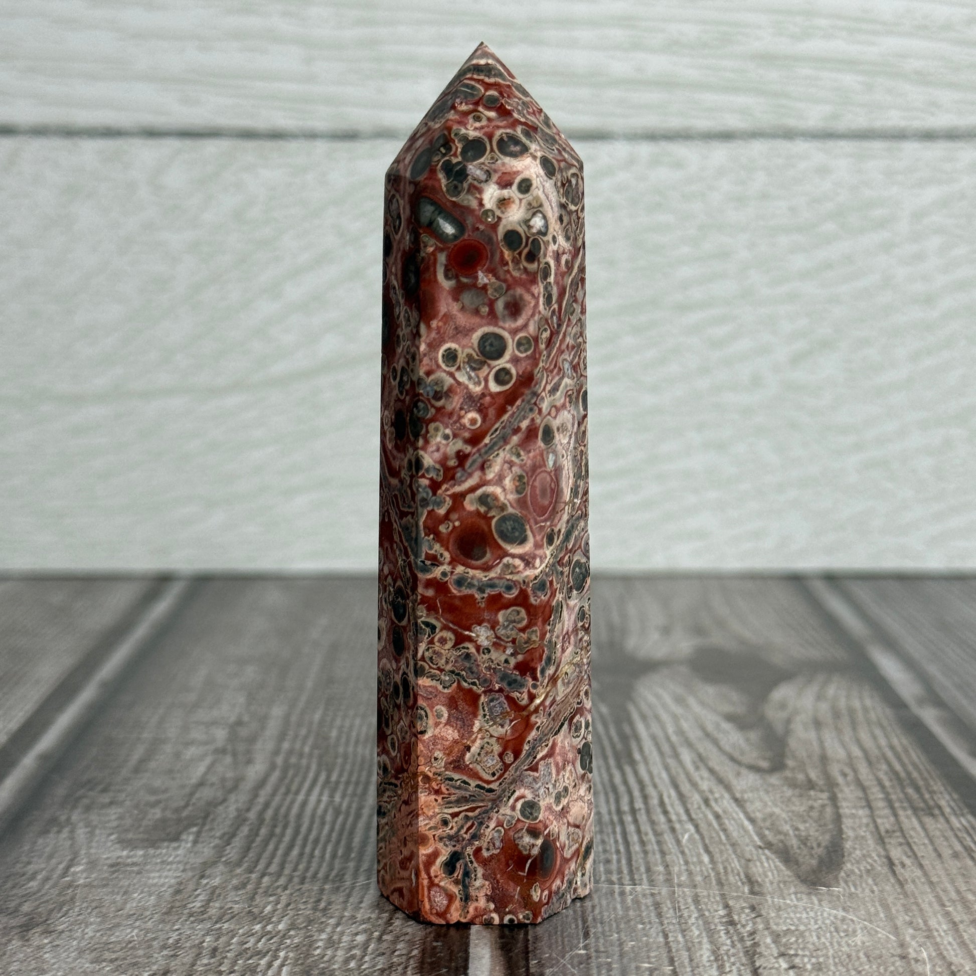 Red Leopard Skin Jasper is a striking variety of jasper characterized by its warm red and brown tones with distinctive spotted or mottled patterns resembling leopard markings. This tower form showcases the stone's natural beauty while making an elegant display piece for any collection. Known in crystal traditions for grounding properties and connection to earth energy, Red Leopard Skin Jasper is valued by enthusiasts for its stabilizing presence. Each tower is unique, with variations in pattern intensity and coloration. Perfect for meditation spaces, home décor, or as a meaningful addition to your crystal collection.